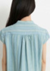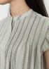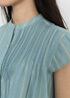 胸元の細かいピンタックと短めの袖が可憐なブラウス。低めのスタンドカラーですっきりとしたシルエットもポイントです。