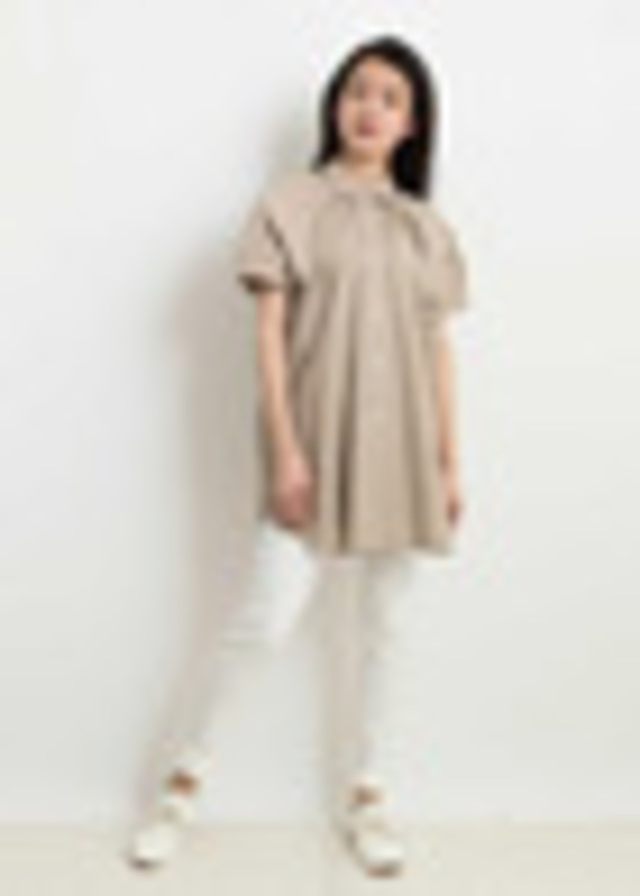 身頃全体に入ったギャザーが個性的なシルエットを生み、涼しげな印象を放つチュニック。スリムなボトムに合わせて。