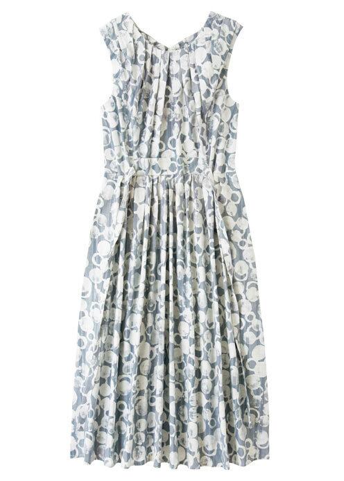 胸もとのタックがやさしい印象を放つロングワンピは、リゾート気分で着こなせる1枚。ブレスレットやピアスで味付けしても。